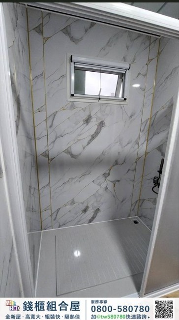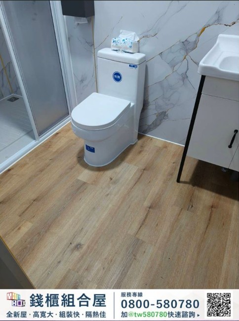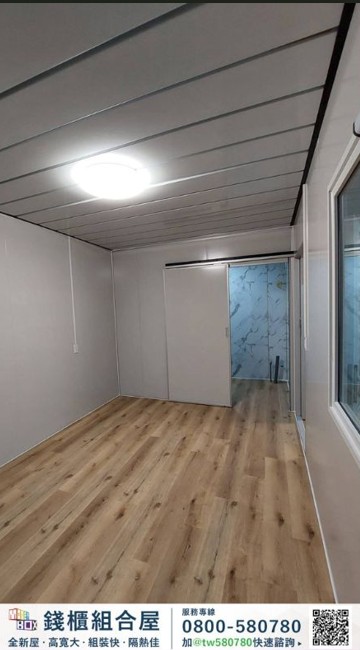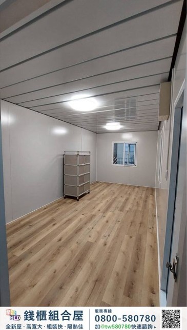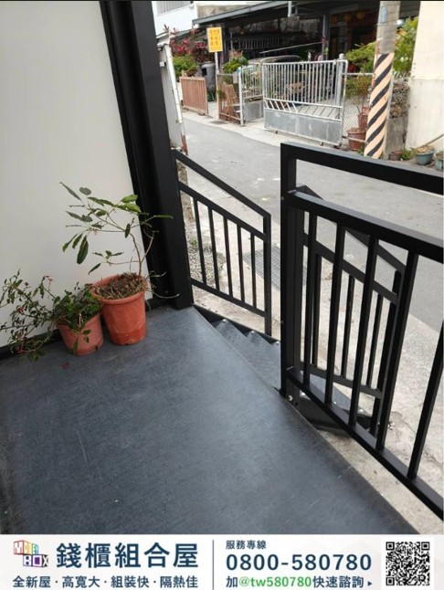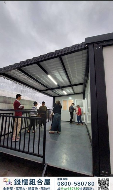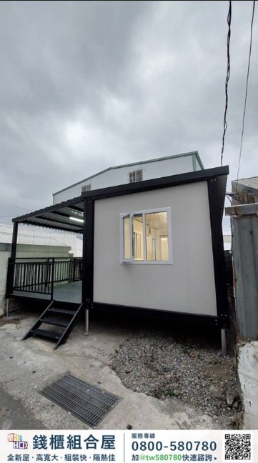 本案共設置 2套組合屋,搭配 1座戶外露臺空間,室內使用面積約 11坪,室外露臺約 5.5坪,透過模組化設計,使空間規劃更具彈性,同時提升室內外生活的連結感。